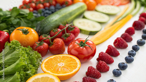 Fresh colorful vegetables and fruits arranged in vibrant pattern on white surface, symbolizing healthy diet and nutrition for digestive wellness and gut health.