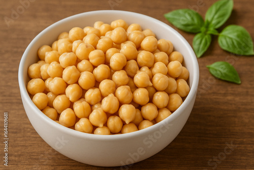 Fresh cooked chickpeas in white bowl with basil leaves on wooden table, healthy plant-based protein food ingredient