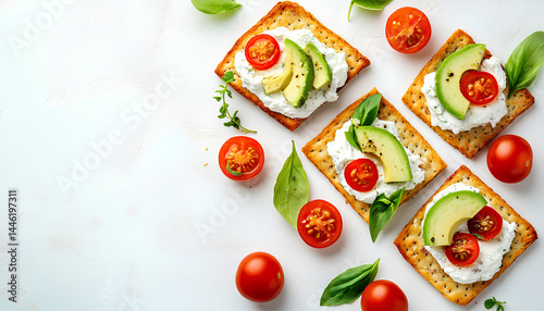 crispbread, cheese, avocado, tomatoes, healthy, snack, vegetarian, cream, fresh, meal, lunch, light, diet, fiber, delicious, tasty, epicure, natural, crunchy, breakfast, white, background, isolated, nourishment, organic, vegetarian, clean, simple, modern, macro, closeup, cookery, cooking, receipe, epicure, minimal, plate, dish, creative