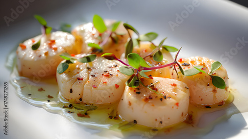 Fresh Cured Scallops with Lemon and Microgreens on a White Plate