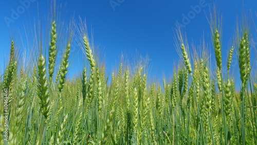 Fresh ears of young green wheat on nature in spring field under clear blue sky. Agriculture summer background. Large crop of grain.
