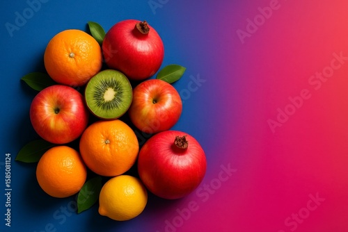 Fresh fruit arrangement featuring apples, oranges, pomegranates, lemon, and kiwi, creating a healthy and colorful display on a vibrant gradient backdrop.