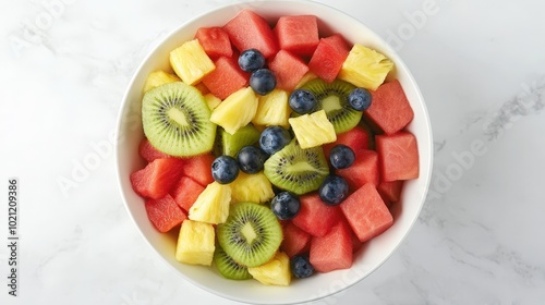 Fresh fruit salad with watermelon, pineapple, kiwi, and blueberries in a white bowl.