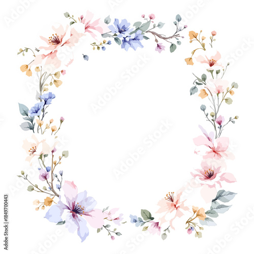 Fresh garden inspired blossoms forming a delicate artistic frame on clean white canvas
