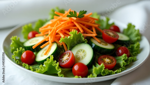 Fresh Garden Salad with Carrots Cucumbers and Tomatoes A Healthy and Colorful Dish on a White Plate