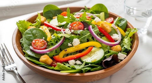 Fresh Garden Salad with Mixed Greens and Vegetables in a Wooden Bowl.