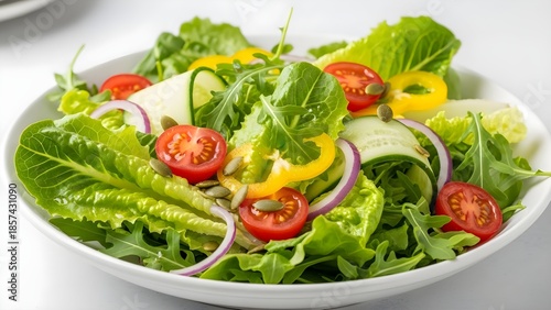 Fresh Garden Salad with Tomatoes, Cucumbers & Lettuce: Healthy Eating, Bright Light, Vibrant Food Photography, Vegetarian Meal, Organic Ingredients, Studio Shot