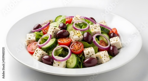 Fresh Greek Salad with Feta, Olives, Tomatoes, Cucumber, and Red Onion on White Plate