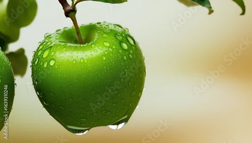 Fresh green apple with sparkling water droplets, captured in high detail for a refreshing look.