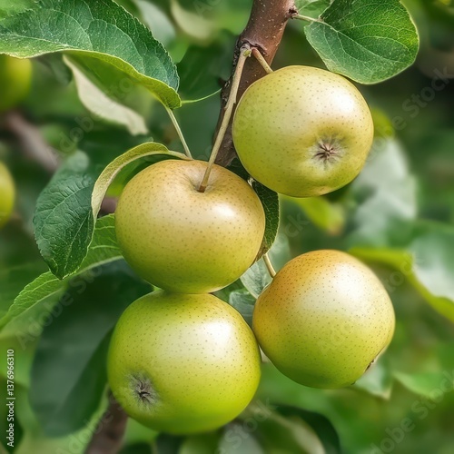 Fresh green apples hanging on a tree branch