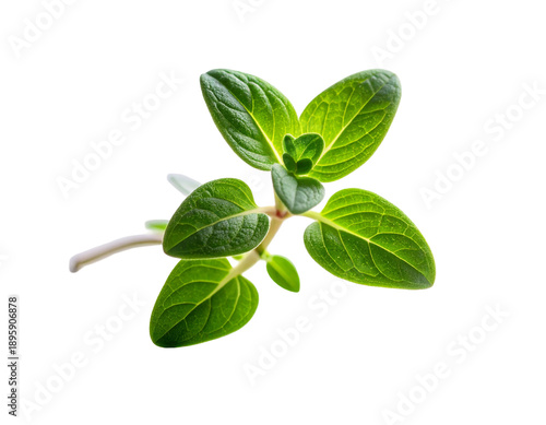 Fresh green herb sprig with vibrant leaves against a dark background