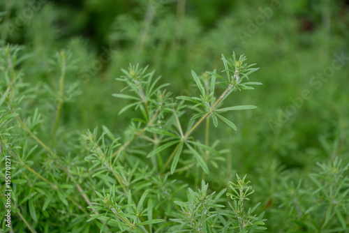 Fresh green leaves of cleavers (Galium aparine) with a green background.