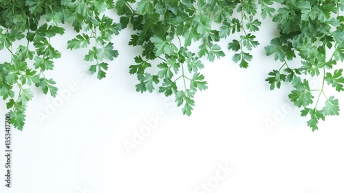 Fresh green parsley leaves cascading over a clean white background, ideal for culinary and lifestyle imagery