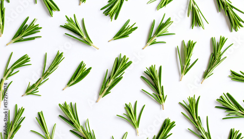 Fresh green rosemary sprigs arranged on white background, showcasing vibrant texture and natural beauty of herb in clean and bright setting
