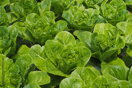 Fresh green salad costa vegetables in a vegetable garden for background