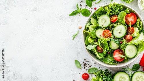 Fresh Green Salad with Tomatoes and Cucumber on White Background