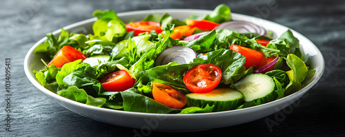 Fresh Green Salad with Tomatoes, Cucumbers, and Red Onion in a White Bowl