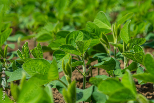 Fresh green soybean plants thriving in a sunlit field on a warm spring day in rural farmland