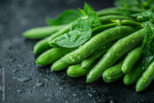 pea, snap, sugar, green, fresh, vegetable, dew, drop, water, moist, vibrant, healthy, alimentary, delicious, legume, food, produce, garden, farm, agriculture, cooking, receipe, ingredient, vitamin, mineral, spring, summer, harvest, organic, natural, raw, closeup, macro, background, texture, dark, black, glossy, shiny, leaf, leaf, plant
