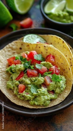 Fresh guacamole taco with tomatoes and cilantro on rustic background. Authentic Mexican appetizer. Healthy vegetarian cuisine. Close-up food photography for recipe blog