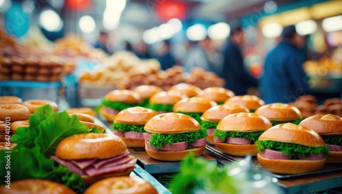 Fresh hamburgers at a market stall with people shopping in the background. Food market and street food, concept. Fast food and cuisine. The concept of food vendors and street-style dining