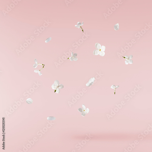 Fresh lilac blossom, Beautiful white lilac flowers falling in the air isolated on pink background. Zero gravity or levitation spring flowers conception, high resolution image
