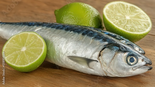 Fresh Mackerel with Lime Wedges on Wooden Board