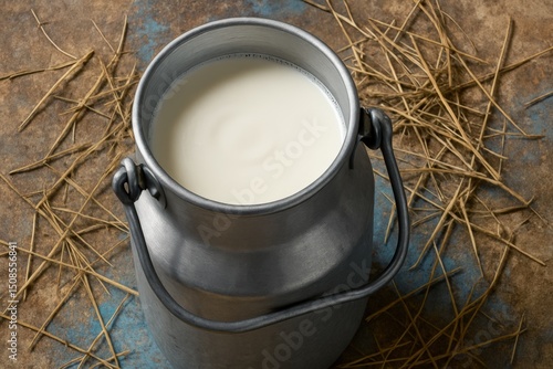 milk, can, metal, dairy, farm, fresh, rustic, vintage, traditional, food, drink, liquid, creamy, white, container, aluminium, still life, product, studio, shot, top, view, agriculture, country, simple, clean, background, hay, straw, texture, surface, blue, brown, grain, rural, healthy, natural, nourishment, diet, cattle, cow, domestic, animal, object, table, design, style, empty, space
