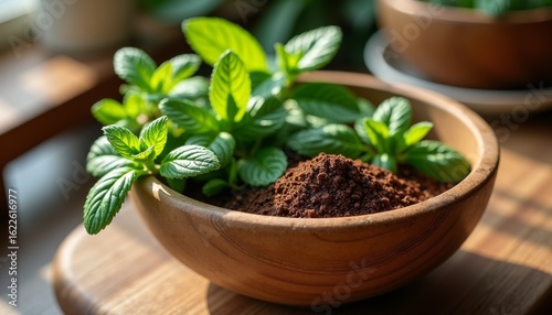 Fresh Mint Leaves and Ground Herbs in Wooden Bowl on Table