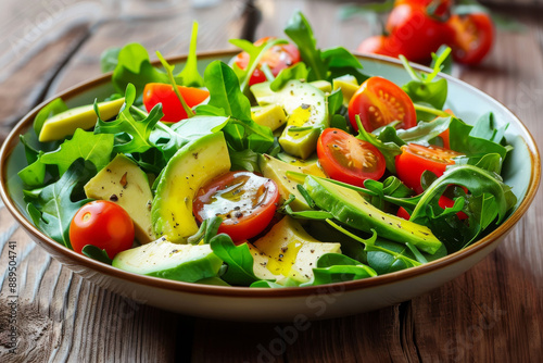 Fresh mixed greens salad with avocado, cherry tomatoes, and various vegetables in a rustic bowl on a wooden table.