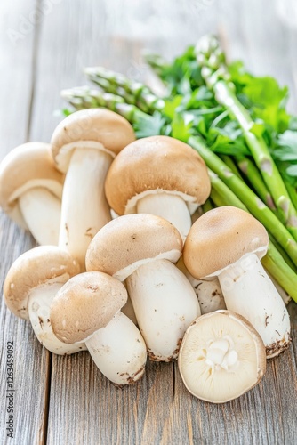Fresh mulberry mushrooms and shiitake mushrooms alongside vibrant asparagus on a rustic wooden table in soft natural light