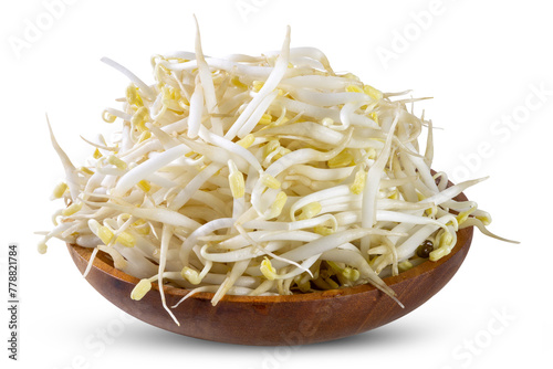 Fresh mung bean sprouts in a wooden bowl isolated on white background