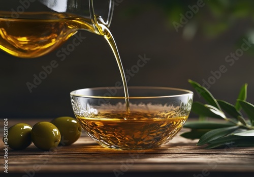Fresh Olive Oil Pouring into Crystal Bowl Surrounded by Olive Branches and Olives on Wooden Table in Warm, Inviting Kitchen Setting