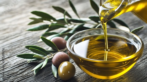 Fresh Olive Oil Pouring into Glass Bowl with Olives and Leaves, Perfect for Healthy Food, Cooking, Mediterranean Diet, Organic Ingredient Concept