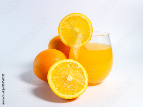 Fresh orange juice in a glass with whole and sliced oranges on a white background