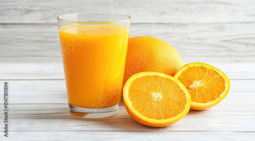 Fresh orange juice in glass next to sliced oranges on a light wooden surface