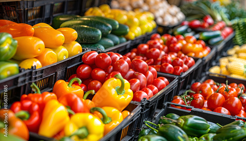 Fresh organic Vegetables and fruits on shelf in supermarket, farmers market. Healthy food market concept