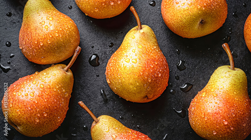 Fresh pears glistening with water droplets on a sleek black surface in stunning close-up