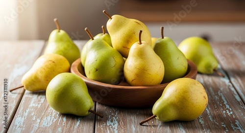 pear, fruit, fresh, healthy, food, produce, nature, vitamin, nourishment, organic, bowl, wooden, table, yellow, green, ripe, delicious, healthy eating, diet, snack, dessert, autumn, harvest, seasonal, vitamin c, vitamin a, fiber, juicy, sweet, crisp, juicy fruit, antioxidant, potassium, natural, healthy snack, food photography, still life, closeup, fruit bowl, table setting, rustic, wood, background, light, shadow