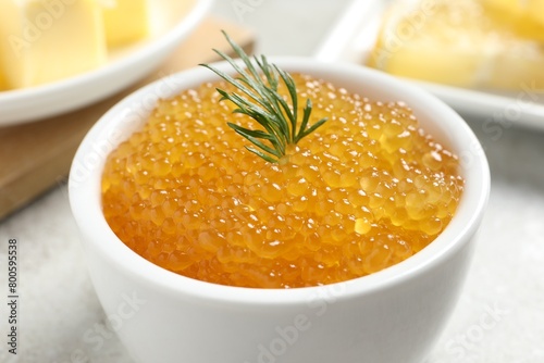Fresh pike caviar and dill in bowl on light grey table, closeup