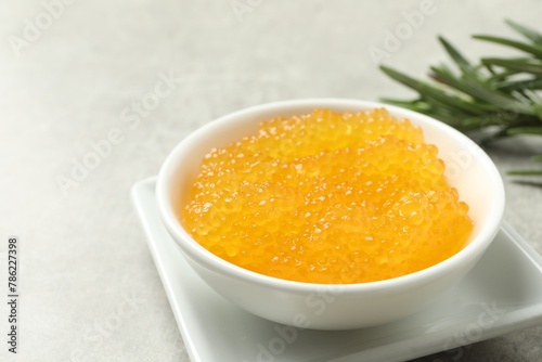 Fresh pike caviar in bowl and rosemary on light grey table, closeup
