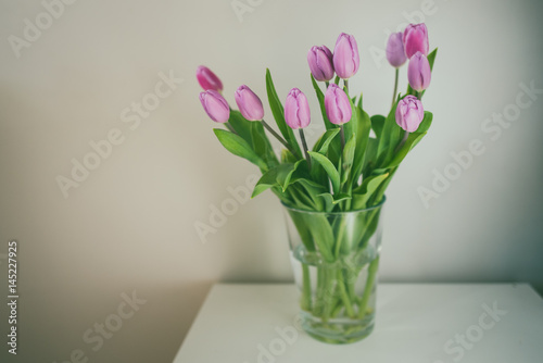 Fresh pink tulip flowers bouquet in a glass jar on white table