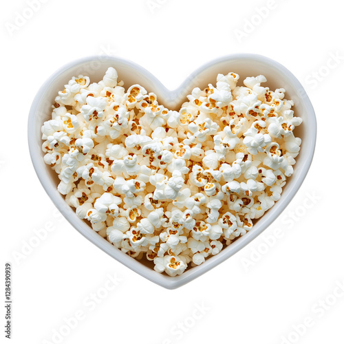 Fresh popcorn in white heart shaped bowl isolated on transparent background