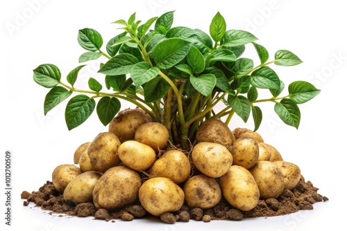 Fresh potato plant with tubers, isolated against a white background, perfect for culinary inspiration and agricultural