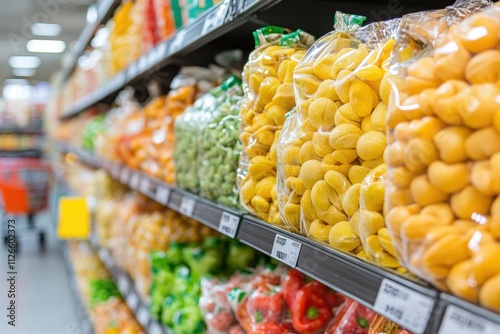 supermarket, food market, shelf, shelf, produce, fruit, vegetable, bag, yellow fruit, orange fruit, food, health food, retail, market, store, shopping, consumerism, abundance, fresh, healthy, vibrant, colourful, display, delicatessen, food market