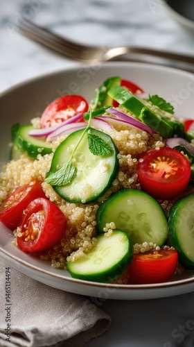 Fresh Quinoa Salad with Cucumbers Tomatoes Avocado and Red Onion on a Marble Tabletop