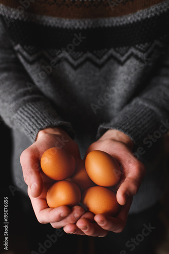 Fresh, raw eggs lie in the hands. Healthy eating. Easter composition.