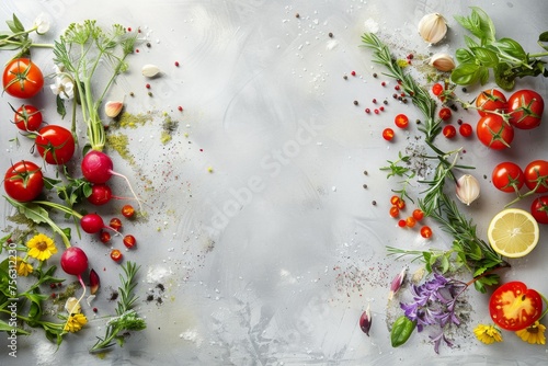 Fresh raw vegetables spices on the marble floor
