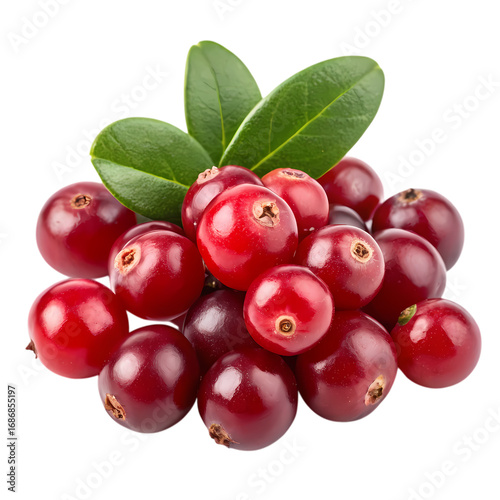 Fresh red cranberries with green leaves isolated on transparent background