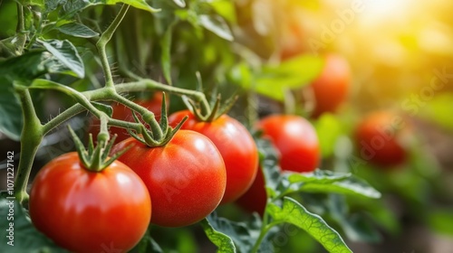 Fresh Red Tomatoes Growing in Garden at Sunset